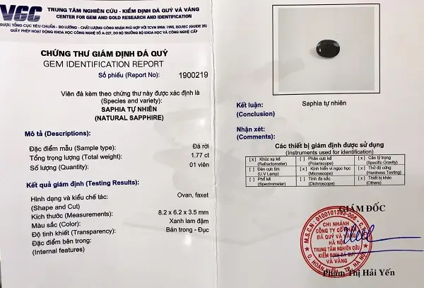 Kèm đầy đủ chứng thư kiểm định đá quý do trung tâm kiểm định đá quý Việt Nam cấp theo tiêu chuẩn quốc tế