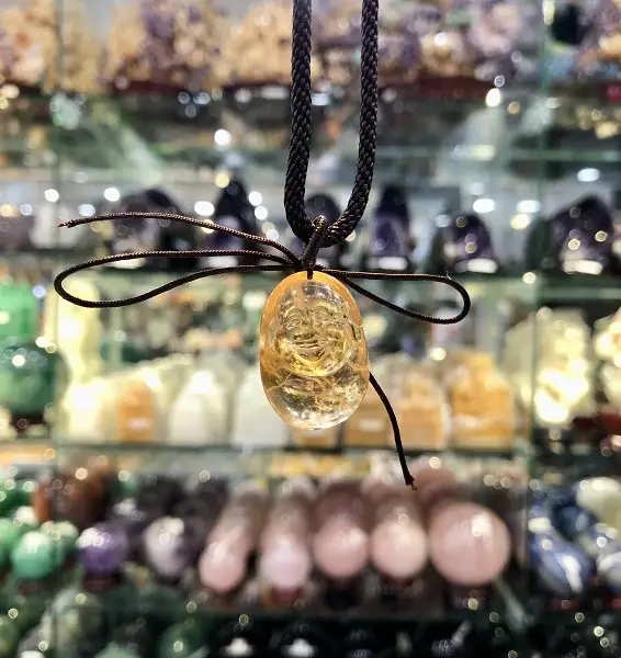 Mặt dây chuyền phật di lặc thạch anh vàng - Trì chú đá tại chùa thiêng