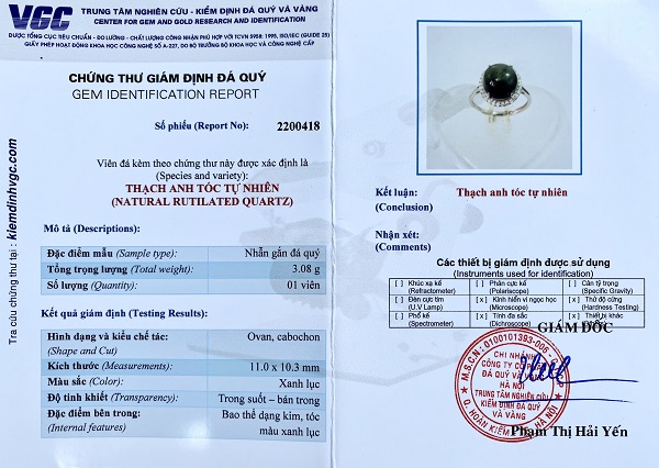 Nhẫn đá thạch anh tóc xanh phong thủy - Kèm chứng thư kiểm định đá quý thiên nhiên