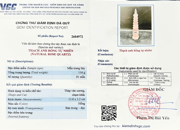 Tháp văn xương đá thạch anh hồng - Kèm chứng thư giám định đá quý