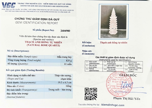 Tháp văn xương đá thạch anh hồng - Kèm chứng thư giám định đá quý